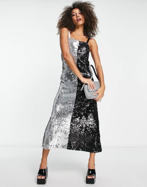 Extro Vert Vestito lungo con spalline sottili in paillettes argento e nero a contrasto Very well made.